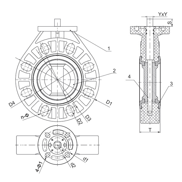 Spesifikasjon D1(mm) D2(mm) D3(mm) D4(mm) T(mm) n-Φ(mm) YxY(mm) S(mm) d1(mm) d2(mm) 4-Φ1(mm)