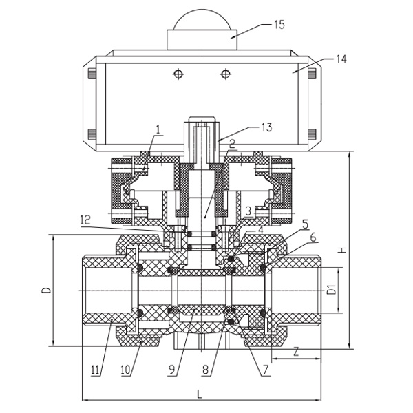 PVC-U Q661F-10U pneumatisk dobbel union kuleventil DN15-100 GB Standard
